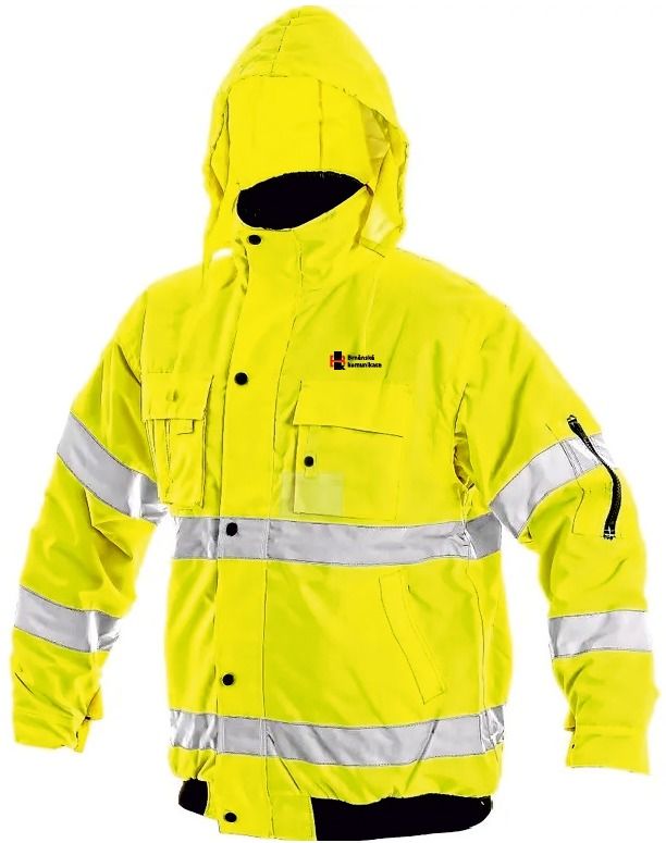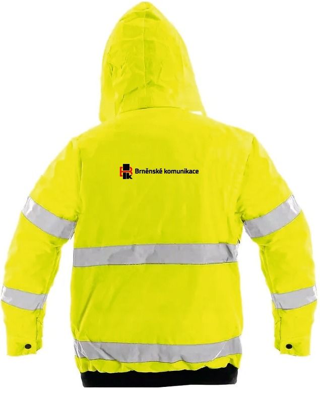 Výstražná zimní bunda s odepínatelnou kapucí(umístěna v límci) a rukávy.